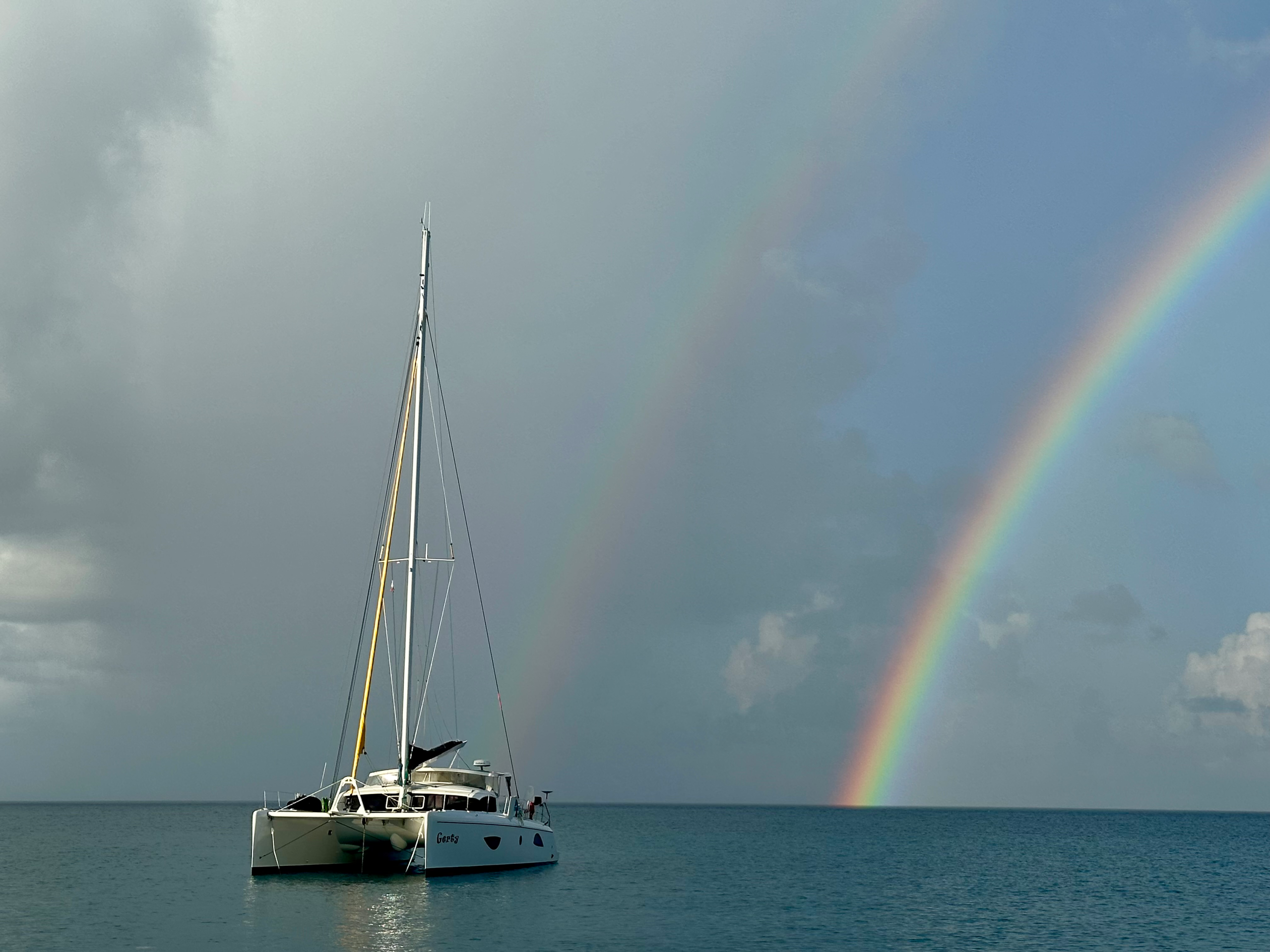 Gerty was a 4 cabin version of the 49. The previous owner converted the Starboard forward cabin into a storage / utility room so she currently has 3 sleeping cabins. She has two heads plus a sperate interior shower room. An 800 AH lithium-iron-phosphate 12V house battery array is primarily charged by a 1320W solar array. Additionally Gerty has 800W of removable solar panels for her trampolines. A large inverter provides 120V power when needed. She has an efficient plumbing system with fresh or salt water heads, rain collection, a 32gph water maker, and 48 gallon (182L) capacity of gravity discharged waste water holding tanks.